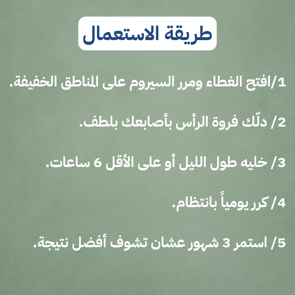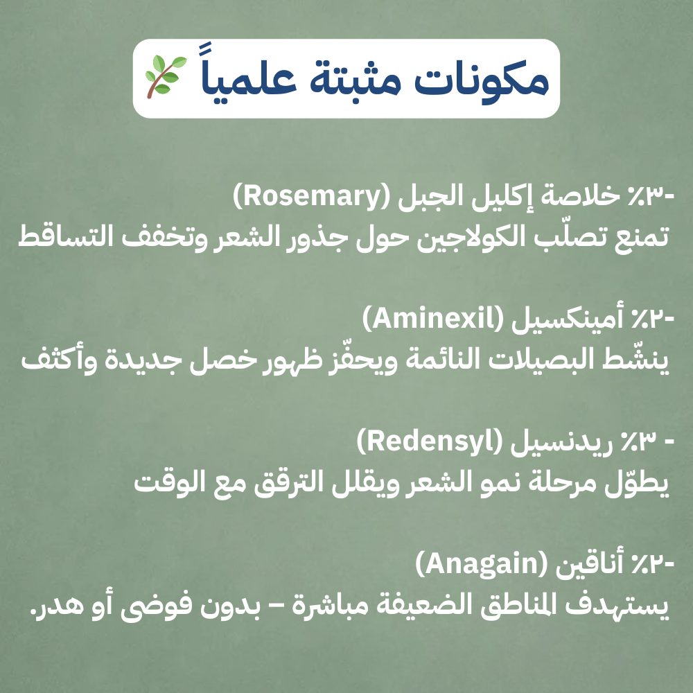 التركيبة هذي تحتوي مكونات معروفة علمياً لتحفيز نمو الشعر وتقليل التساقط. أنصح فيه لأي شخص يعاني من ضعف أو فراغات قبل التفكير بالزراعة